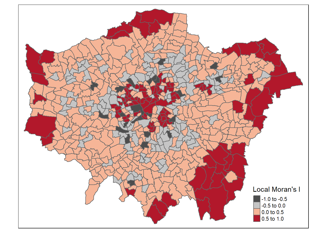 MoranColours<- rev(brewer.pal(8, "RdGy"))Remember Moran’s I - test tells us whether we have clustered values (close to 1) or dispersed values (close to -1) of similar values based on the spatial weight matrix that identifies the neighoburs