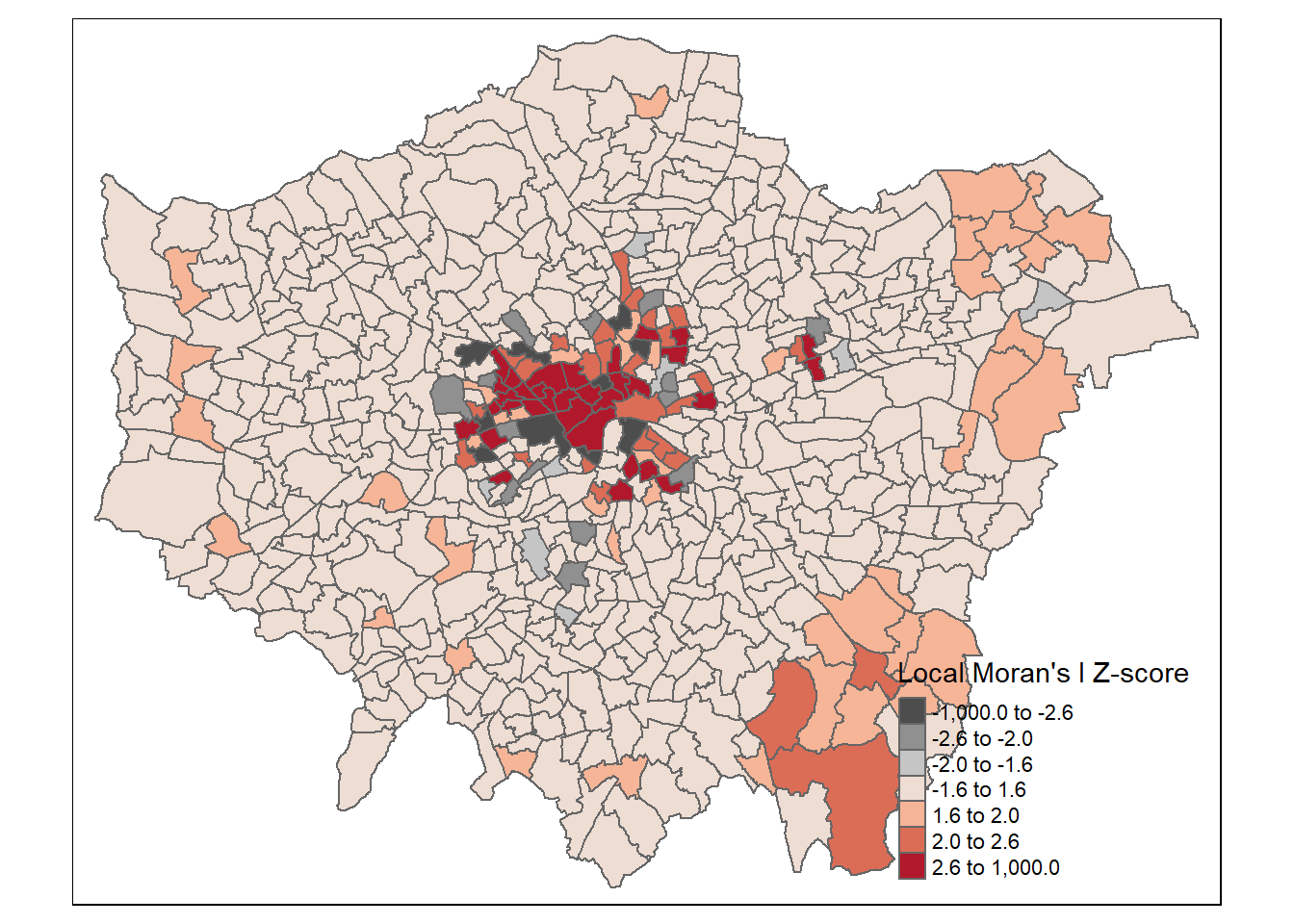 But… the z-score shows were this is unlikely because of complete spatial randomness and so we have spatial clustering (either clustering of similar or dissimilar values depending on the Moran’s I value) within these locations…