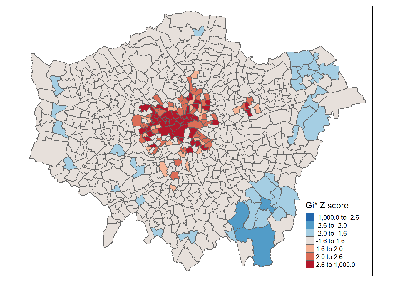 - where there are intense high/low values (e.g. Getis Ord \(G_{i}^{*}\) )