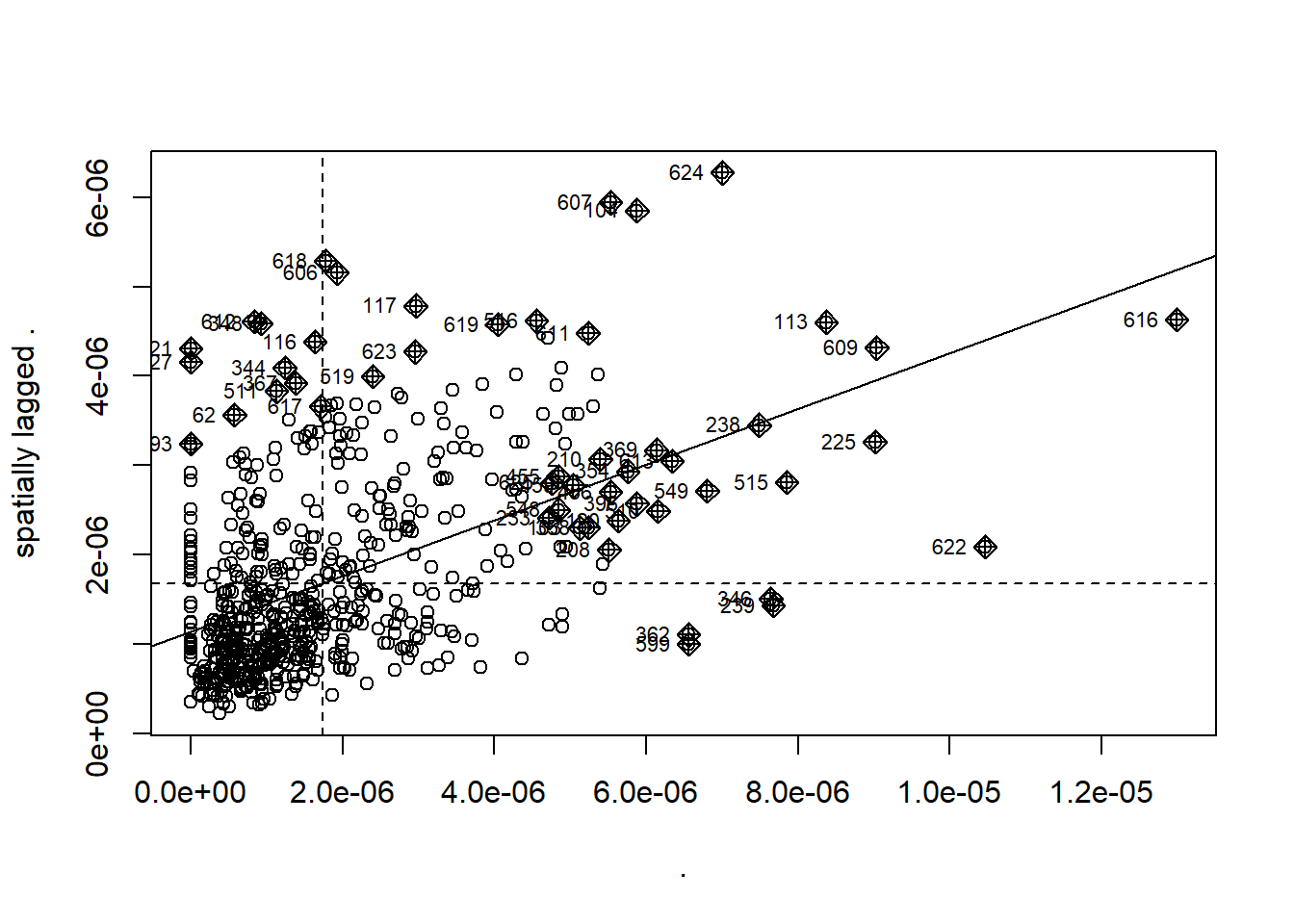 This is useful as we can express the level of spatial association of each observation with its neighboring ones. Points in the upper right (or high-high) and lower left (or low-low) quadrants indicate positive spatial association of values that are higher and lower than the sample mean, respectively. The lower right (or high-low) and upper left (or low-high) quadrants include observations that exhibit negative spatial association; that is, these observed values carry little similarity to their neighboring ones.