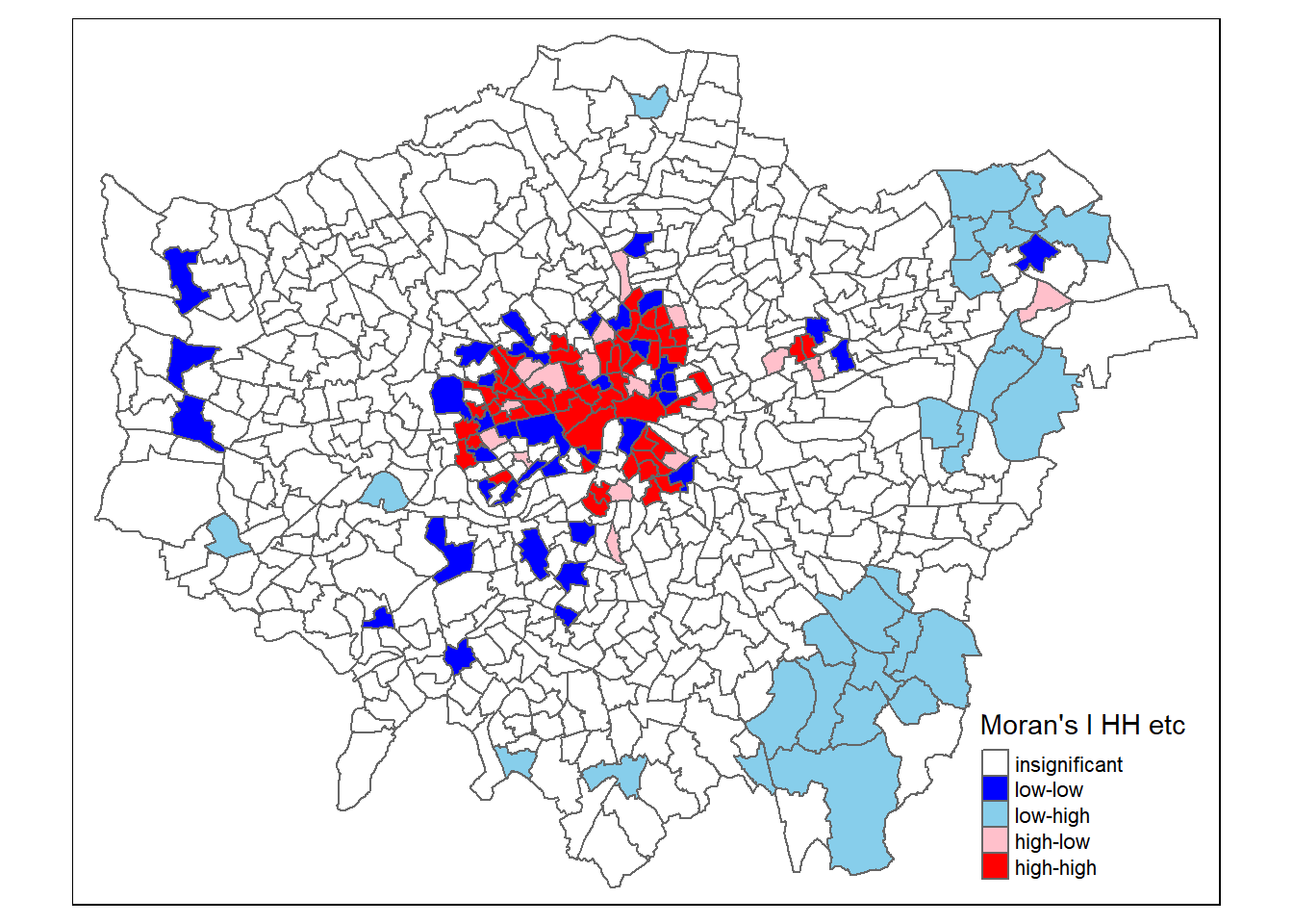 In Moran’s I this is just the value of the spatial unit (e.g. polygon of the ward) compared to the neighbouring units.