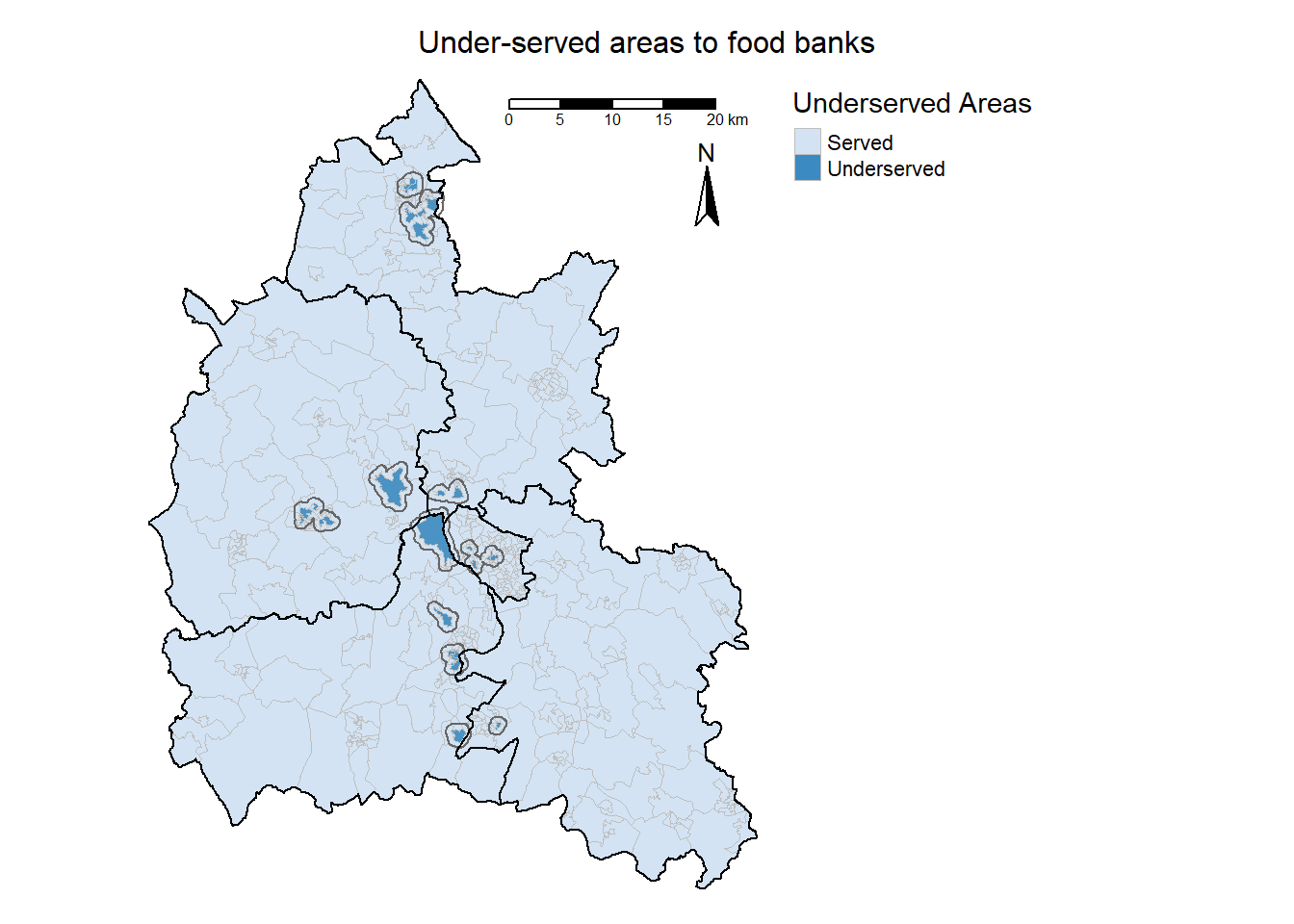 tm_layout(main.title = "Under-served areas to food banks", main.title.position = "centre",